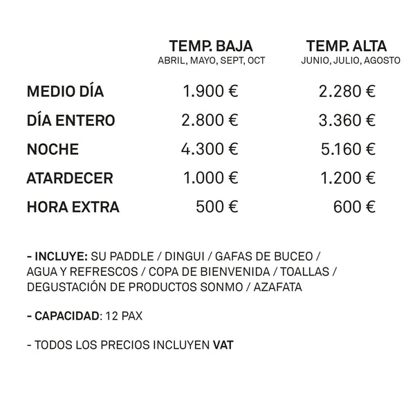 Incluye: Stand Up Paddle, Dingui, Gafas de Buceo, Copa de Bienvenida, 2 personas de tripulación.