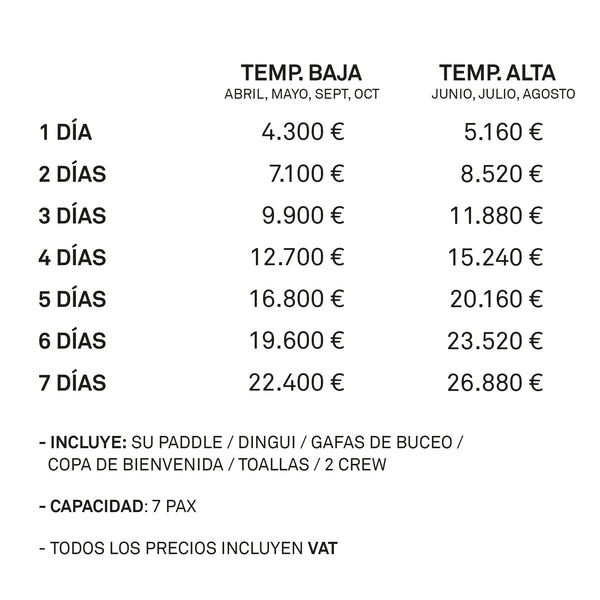 Precio semanal de 26.880 € (IVA incluido)