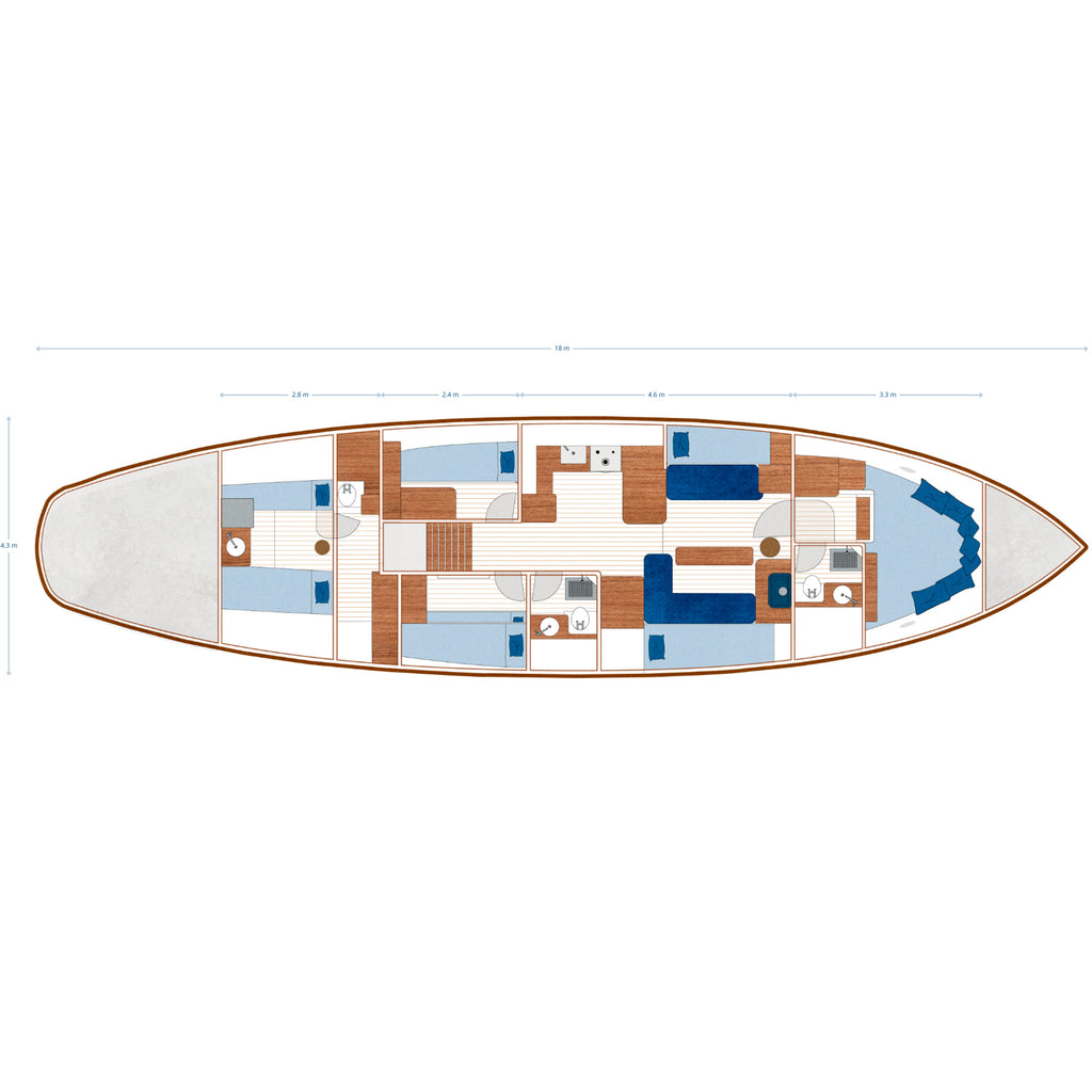 Kilena es un ketch marconi equipado con todas las comodidades, cuenta con un interior muy luminoso y con un marcado acento escandinavo. Su generosa regala y amplia cubierta hacen que el Kilena parezca más grande y espacioso que otros barcos de dimensiones similares. El velero está tripulado por dos personas y su capacidad es de siete pasajeros. Tiene un camarote principal muy espacioso en proa, con una cama de grandes dimensiones. Su bote auxiliar es de propulsión eléctrica. El Kilena ha sido objeto de numerosas reparaciones durante la última década y hoy es un clásico que se encuentra en perfecto estado de conservación.