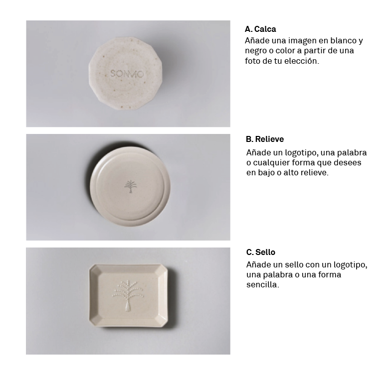 Existen diversas técnicas para aplicar una marca o un logotipo a cada pieza de cerámica, ofreciendo un acabado único y personalizado.